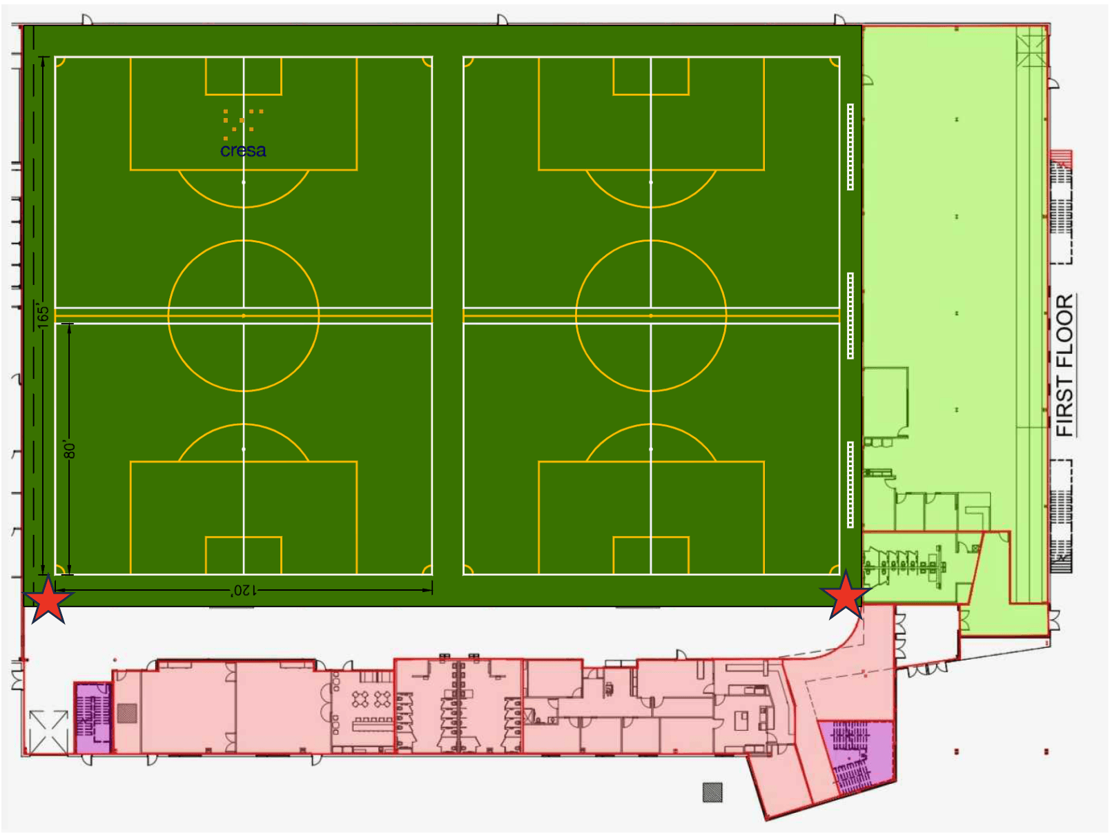 Teams registered as U15 and younger, playing 6 v 6, will play north / south, using the white quad lines. Coaches and athletes access the turf surface where the red stars are. Please leave them a clear walkway.